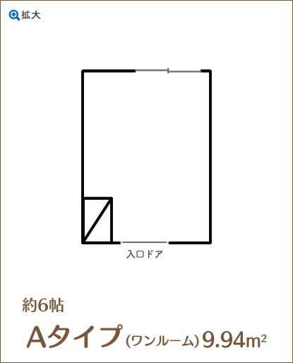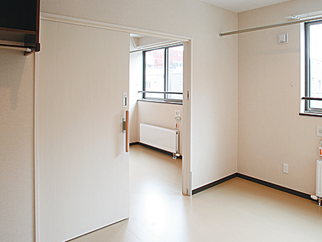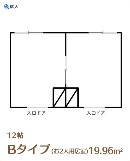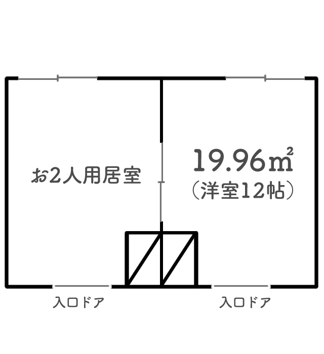 | 間取り | ワンルーム、お2人用居室 (ともに浴室/トイレ共用) 約6帖または12帖 |