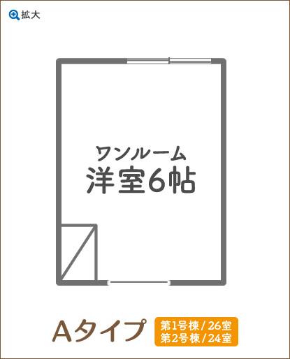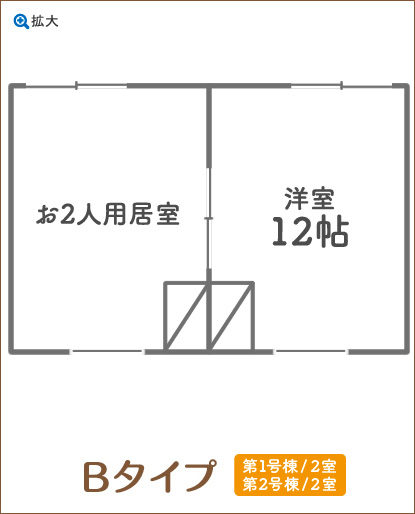 | 間取り | ワンルーム、お2人用居室 (ともに浴室/トイレ共用) 約6帖または12帖 |